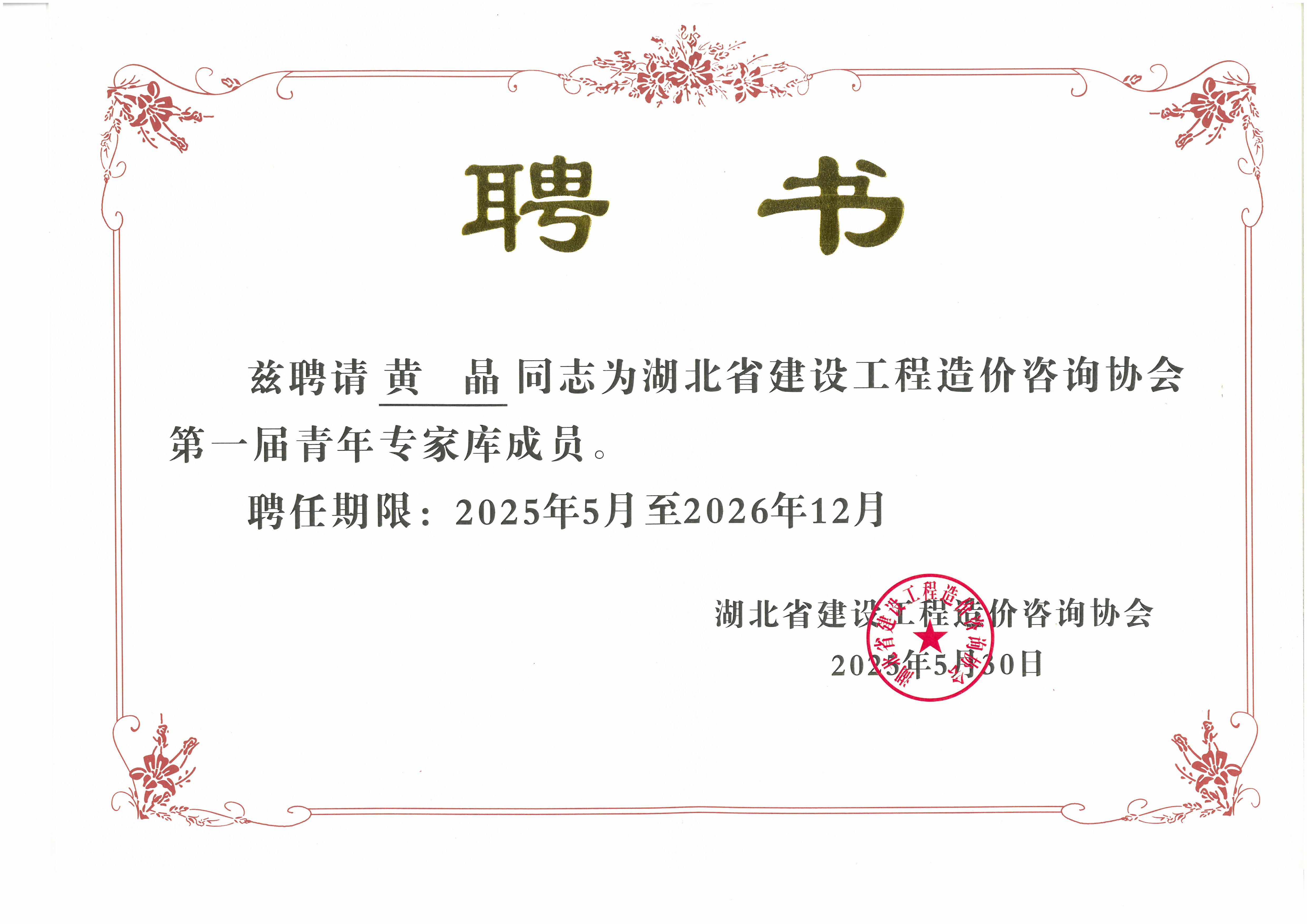 此次入選湖北省建設工程造價咨詢協會第一屆青年專家庫,不僅是對黃晶個人專業能力的高度認可,更是對我司在工程造價領域專業水平的肯定。這既是一份榮譽,更是一份責任。